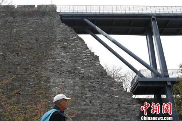 ↑資料圖:南京650歲古城墻“植入”了灰色的現(xiàn)代鋼結(jié)構(gòu)橋梁。 泱波 攝