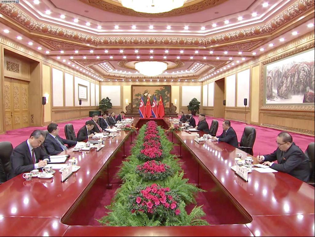 1月8日,中共中央總書記、國(guó)家主席習(xí)近平同當(dāng)日抵京對(duì)中國(guó)進(jìn)行訪問的朝鮮勞動(dòng)黨委員長(zhǎng)、國(guó)務(wù)委員會(huì)委員長(zhǎng)金正恩舉行會(huì)談。兩國(guó)領(lǐng)導(dǎo)人在親切友好的氣氛中,就中朝關(guān)系和共同關(guān)心的問題深入交換意見,達(dá)成重要共識(shí)。雙方一致表示,愿共同努力推動(dòng)中朝關(guān)系在新的時(shí)期不斷取得新的發(fā)展,持續(xù)推進(jìn)半島問題政治解決進(jìn)程,更好造福兩國(guó)人民,為地區(qū)和世界和平穩(wěn)定與繁榮發(fā)展作出積極貢獻(xiàn)。
