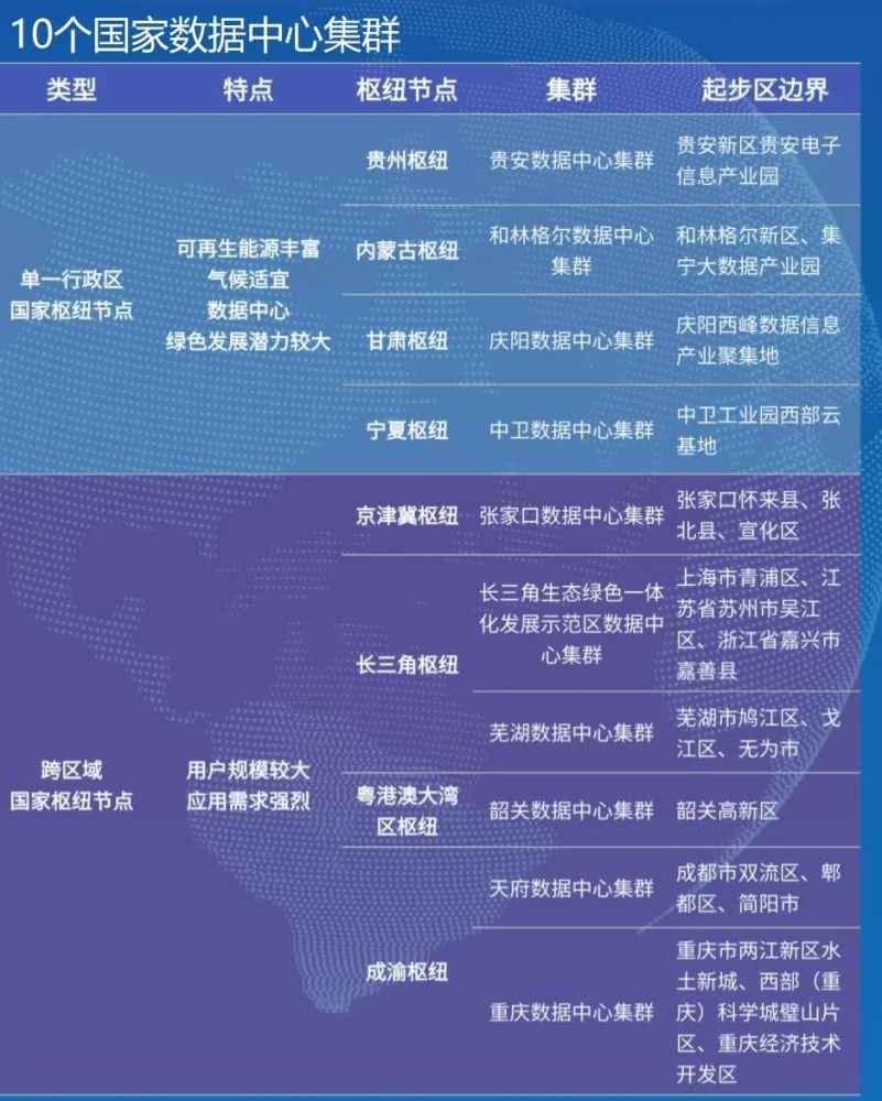 日前,國家發(fā)改委聯(lián)合多部門印發(fā)文件,同意在京津冀、長三角、粵港澳大灣區(qū)、成渝、內(nèi)蒙古、貴州、甘肅、寧夏等8地啟動(dòng)國家算力樞紐節(jié)點(diǎn)建設(shè),同時(shí)規(guī)劃設(shè)立10個(gè)國家數(shù)據(jù)中心集群。