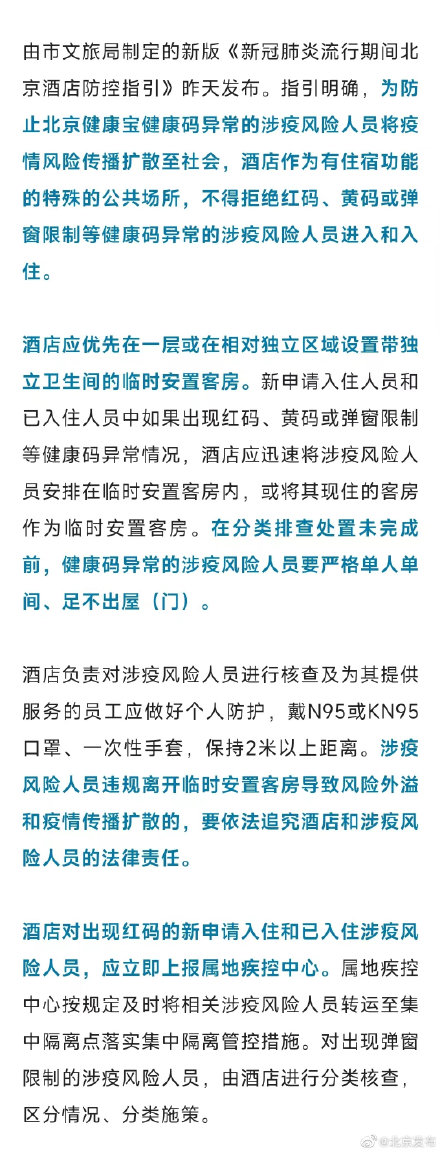 由北京市文旅局制定的新版《新冠肺炎流行期間北京酒店防控指引》昨天發(fā)布。指引明確,為防止北京健康寶健康碼異常的涉疫風(fēng)險人員將疫情風(fēng)險傳播擴散至社會,酒店作為有住宿功能的特殊的公共場所,不得拒絕紅碼、黃碼或彈窗限制等健康碼異常的涉疫風(fēng)險人員進入和入住。