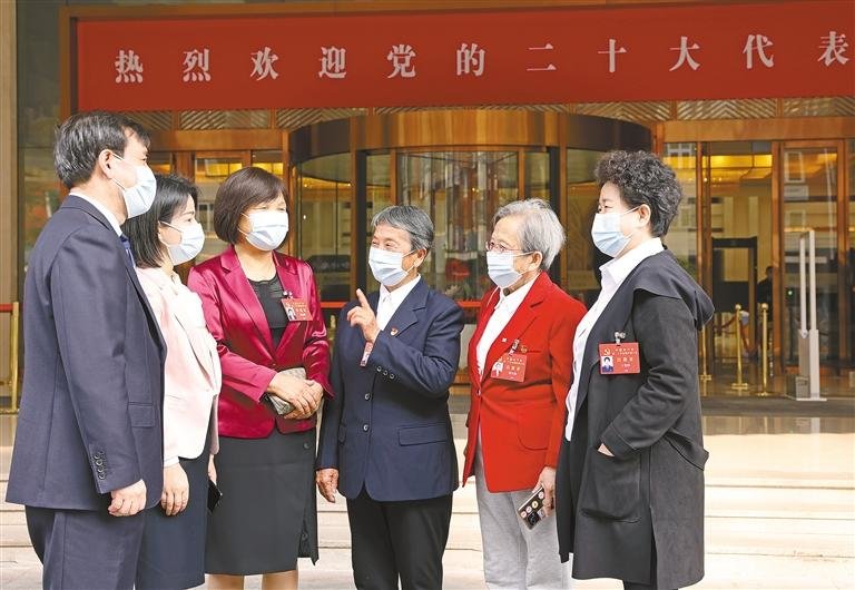 ▲十月十四日,出席黨的二十大的陜西代表王友民、何菲、常亞瓊、張蓮蓮、路生梅、王照輝(左起)在住地交流履職感想。代表們一致表示,將堅決扛起政治責任,以飽滿的熱情認真履行好神圣職責。 記者 母家亮攝