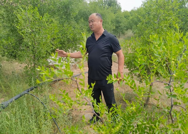 任二換在烏蘭哈少嘎查荒漠治理區(qū)查看酸棗樹長勢。(新華社記者 李云平 攝)