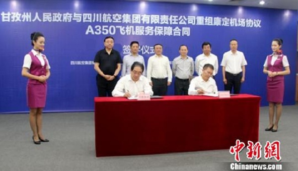 中新網(wǎng)成都9月20日電 (記者 劉忠俊)記者20日從四川甘孜州人民政府、康定機(jī)場(chǎng)集團(tuán)獲悉,歷經(jīng)2年8個(gè)月的反復(fù)洽談磋商,甘孜州政府與四川航空集團(tuán)有限責(zé)任公司已就四川康定機(jī)場(chǎng)集團(tuán)重組正式簽訂協(xié)議,這標(biāo)志著四川康定機(jī)場(chǎng)集團(tuán)重組取得重大進(jìn)展。