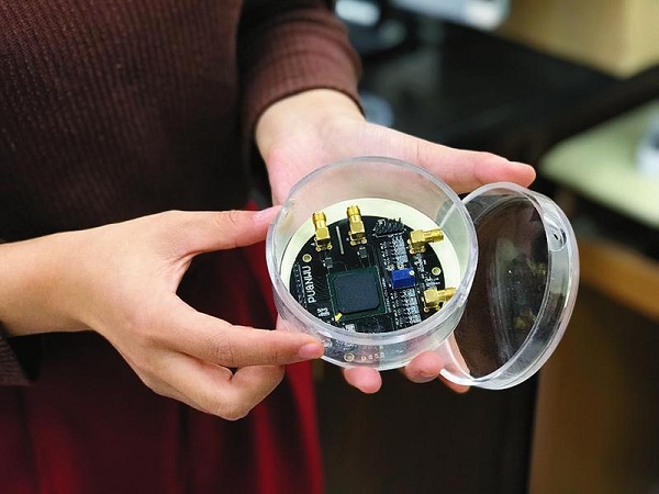 西北大學(xué)研究團(tuán)隊自主設(shè)計的無源物聯(lián)網(wǎng)節(jié)點(diǎn)PLORA,可以不用電池實現(xiàn)遠(yuǎn)距離數(shù)據(jù)采集和傳輸。 記者 張梅攝