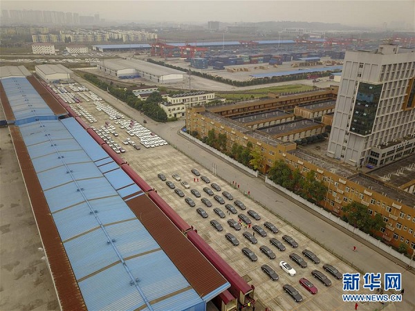 中國(重慶)自由貿(mào)易試驗(yàn)區(qū)的重慶團(tuán)結(jié)村站貨場內(nèi),重慶車企生產(chǎn)的汽車整車在等待運(yùn)輸(2018年11月19日無人機(jī)拍攝)。 新華社記者 劉潺 攝