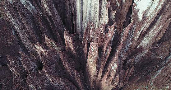 巖鹽天坑南北長約150米、東西寬60米、深50米。尖銳挺拔的鹽石林似一把把利劍倒插坑底,劍刃指向天空,給人強(qiáng)烈的視覺震撼。