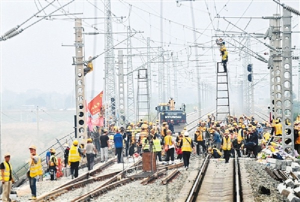 23日下午,施工現(xiàn)場內(nèi)雖然氣氛緊張,但各項工作都在有條不紊地進行。機器轟鳴不止,500多名鐵路工人各司其職,爭分奪秒地進行著信號連接、測試,道岔連接和電路調(diào)試等作業(yè)。“今天是站改工程的核心工程,主要難點在于控制系統(tǒng)相當復雜,且時間緊、任務重,要在5個小時內(nèi)完成10萬根電纜回路的連通?!敝需F上海局銀西項目部副總經(jīng)理張碩介紹說,此次施工,封鎖施工段鐵路超過四個小時,屬于鐵路二級施工,信號系統(tǒng)、道岔系統(tǒng)、軌道電路環(huán)環(huán)相扣,每個環(huán)節(jié)都有嚴格的時間節(jié)點。記者了解到,此次站改新建的禮泉聯(lián)絡線,自禮泉站西安端區(qū)間引入,向東立交疏解后與西平鐵路貫通,接入禮泉站。該工程全部完工也標志著西銀高鐵陜西段唯一的運軌通道建成,將對西銀高鐵的建設和順利開通運營具有重要意義。