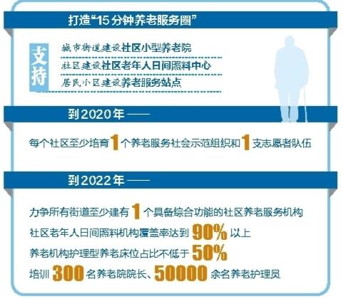 在健全完善養(yǎng)老服務體系方面,我省推動養(yǎng)老服務融合發(fā)展,打造以社區(qū)為平臺、養(yǎng)老服務類社會組織為載體、社會工作者和社區(qū)志愿者為支撐的“四社聯(lián)動”養(yǎng)老服務機制,探索“物業(yè)服務+養(yǎng)老服務”模式,推廣“時間銀行”的做法,開展互助養(yǎng)老服務。到2020年,每個社區(qū)至少培育發(fā)展1個養(yǎng)老服務社會示范組織和1支志愿者隊伍。在推動“15分鐘養(yǎng)老服務圈”建設上,支持在城市街道建設一院(社區(qū)小型養(yǎng)老院)、在社區(qū)建設一中心(社區(qū)老年人日間照料中心)、在居民小區(qū)建設一站(養(yǎng)老服務站點)的嵌入式養(yǎng)老服務網(wǎng)絡,打造“15分鐘養(yǎng)老服務圈”。到2022年,力爭所有街道至少建有一個具備綜合功能的社區(qū)養(yǎng)老服務機構(gòu),社區(qū)老年人日間照料機構(gòu)覆蓋率達到90%以上。