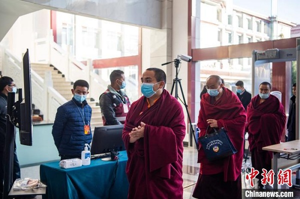 圖為西藏宗教界委員測(cè)溫后步入會(huì)場(chǎng)。 何蓬磊 攝