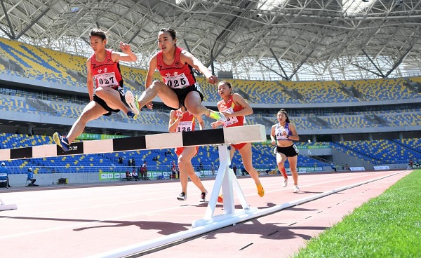 4月28日,在陜西西安舉行的第十四屆全國運動會田徑項目測試賽暨2021年田徑分區(qū)邀請賽(西北賽區(qū))女子組3000米障礙決賽中,甘肅隊選手田萬花(前右)以10分29秒09的成績獲得冠軍。新華社記者李一博 攝