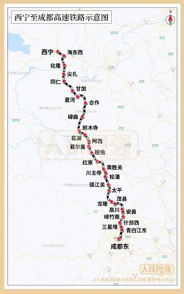 西寧至成都高速鐵路縱跨青海、甘肅、四川,線路自西寧樞紐海東西站引出,先后經(jīng)青海省海東市、黃南藏族自治州、甘肅省甘南藏族自治州、四川省阿壩藏族羌族自治州后,在黃勝關(guān)站與在建中的成蘭鐵路接軌,共線引入成都樞紐。全線共設(shè)車站29個(gè),包括4個(gè)既有車站,25個(gè)新建車站。