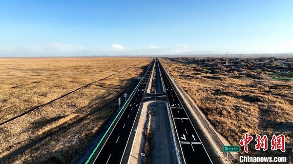 圖為航拍青海格爾木至老茫崖公路擴(kuò)建項(xiàng)目。青海省交控集團(tuán)供圖