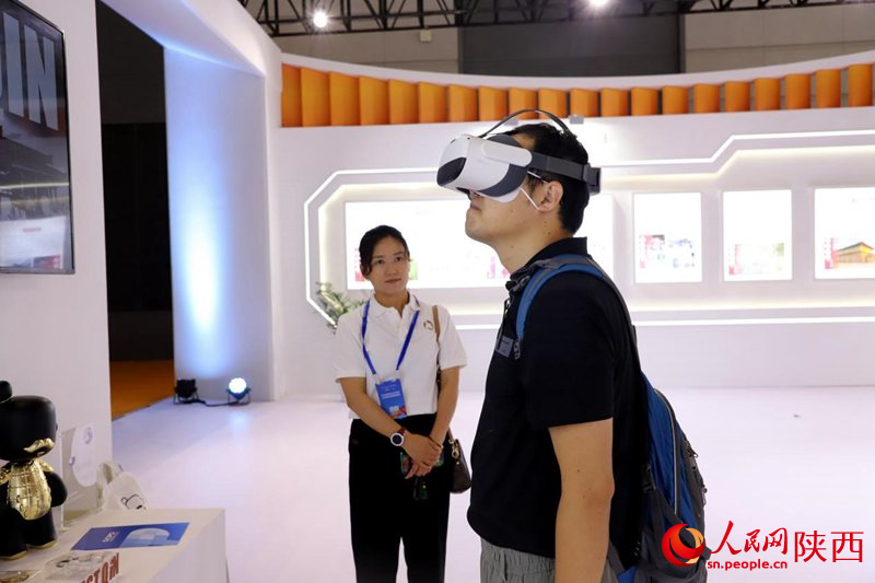 產(chǎn)業(yè)成果館西安展區(qū)游客體驗(yàn)VR眼鏡。人民網(wǎng)記者 孫挺攝