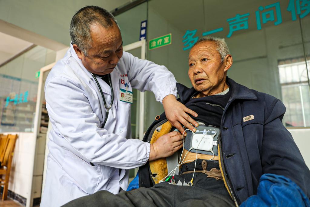 在重慶云陽縣高陽鎮(zhèn)團(tuán)結(jié)村,村醫(yī)正在為患者進(jìn)行心電圖檢查。(李小媛攝)