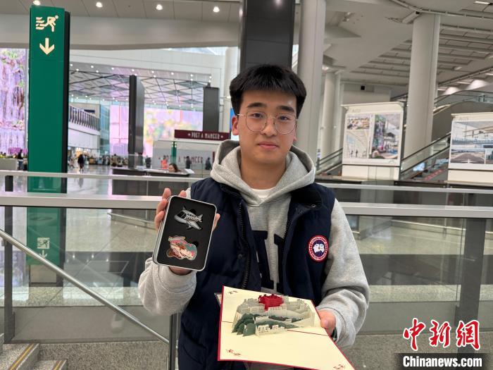 2月19日,西藏航空“拉薩-成都天府-香港”航線開通。圖為首航乘客曾帥向記者展示航空公司派發(fā)的首航紀念徽章和立體賀卡。 中新社記者韓星童攝