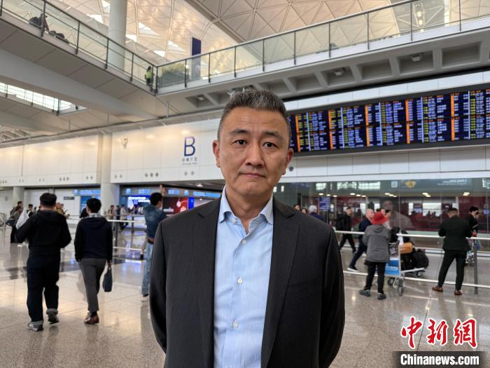 2月19日,西藏航空“拉薩-成都天府-香港”航線開通。圖為西藏航空副總經(jīng)理張兵兵在香港國際機場抵港大堂接受中新社記者采訪。 中新社記者韓星童攝
