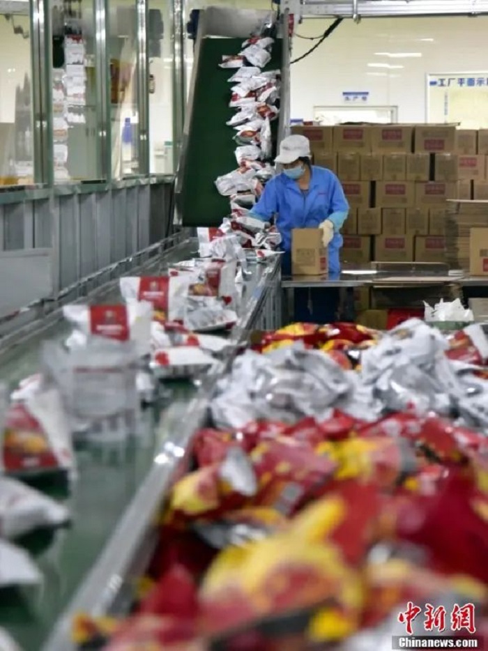 圖為柳州市的一家預(yù)包裝(袋裝)螺螄粉企業(yè)內(nèi),工人們正在生產(chǎn)備貨。中新社記者 王以照 攝