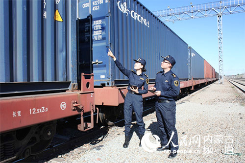 滿洲里海關(guān)關(guān)員正在對準(zhǔn)備從滿洲里口岸出境的中歐班列辦理快速驗放手續(xù)(魯煥新 攝)