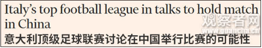 另一位消息人士稱,他們可能會(huì)探討在中國舉辦一場(chǎng)意甲比賽的可能性。此舉可能需要得到亞洲和歐洲足球聯(lián)合會(huì)以及國際足聯(lián)的批準(zhǔn)。