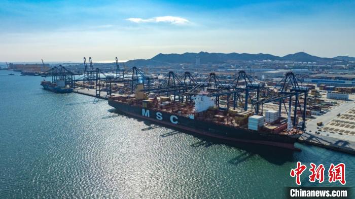 2月18日,地中海航運在大連港開通歐洲與地中海兩條航線。圖為“大連—地中海”集裝箱船。(無人機照片)趙光輝 攝