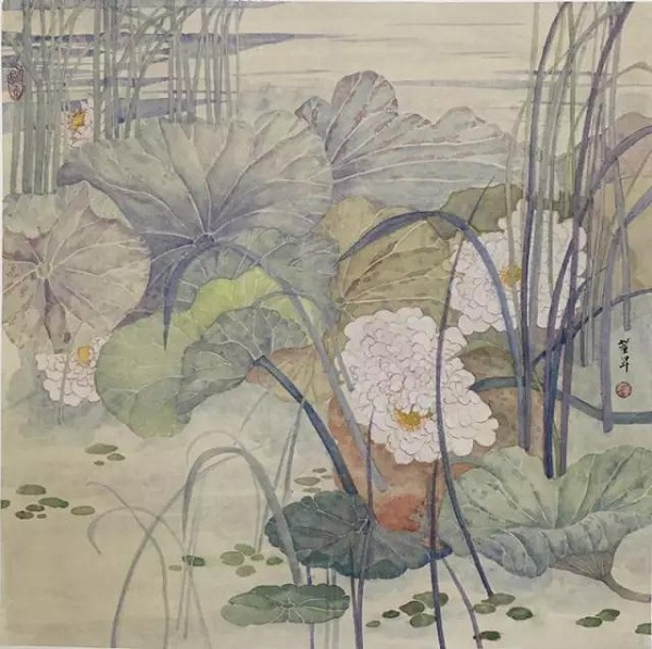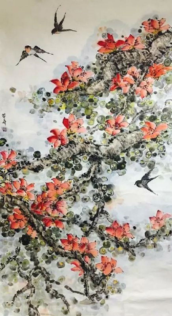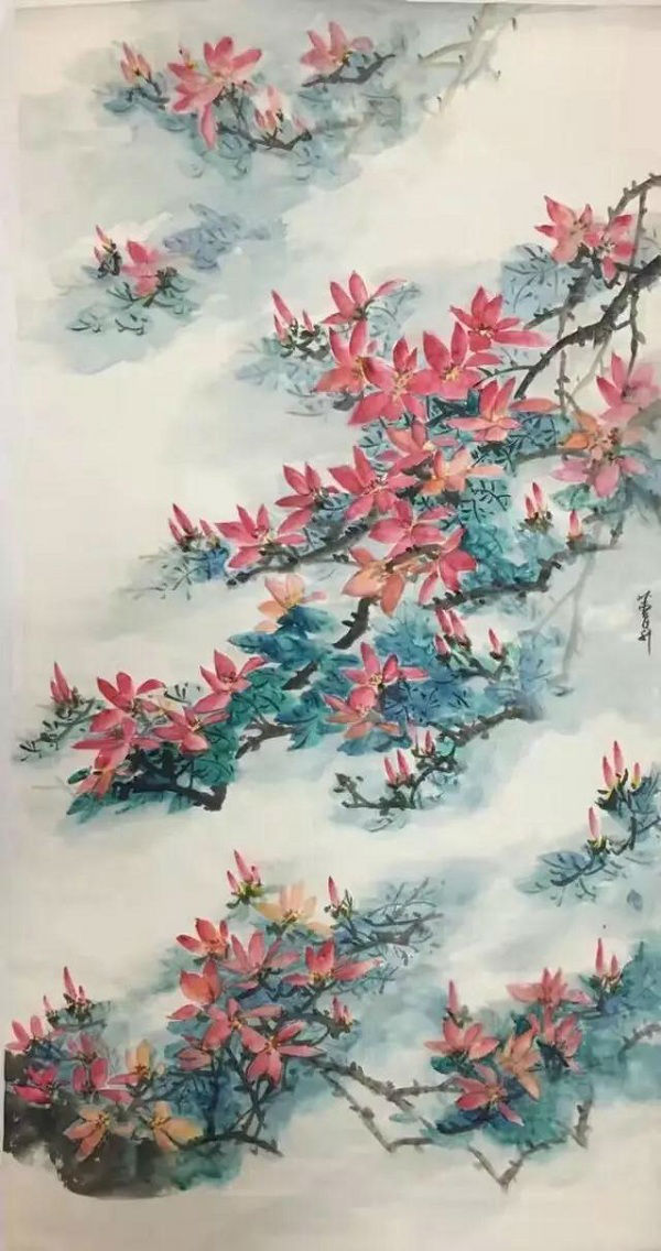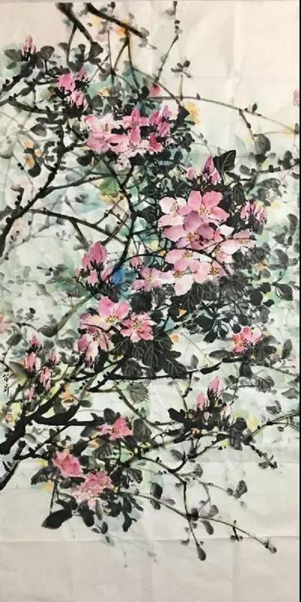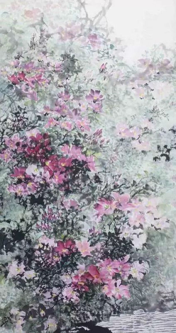 而這枝干的恣意穿插,呈現(xiàn)出生命頑強(qiáng)、堅(jiān)韌的情態(tài),暗合國(guó)畫在邊角與全局相關(guān)的構(gòu)圖關(guān)系,使主客、虛實(shí)、疏密、高低、上下、縱橫曲折之態(tài),在伸、引、回、堵、接、泄之中,使畫面更顯和諧飽滿。而近些年,她更從老師賈廣健身上,學(xué)到了一種新的沒骨表現(xiàn)之法,使自己的藝術(shù)造詣,不斷爬升。