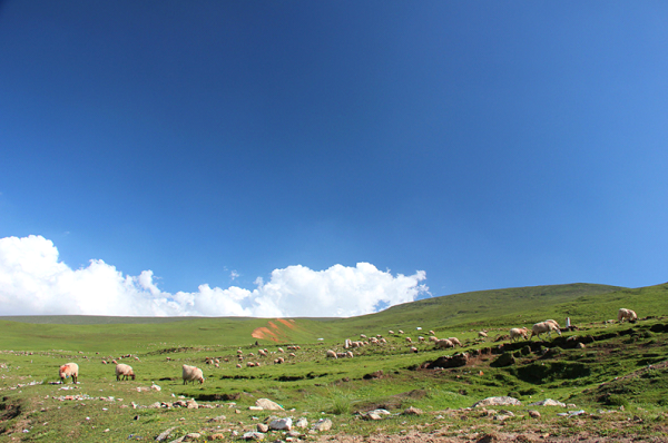 穿越海拔4000多米的時候,一團又一團的白云從車子前飄過,伸出手說不準能采一朵呢!穿過最高峰,車子沿著盤山公路下去,停在山腳,再向山上望去,竟有一種虛幻感,還以為自己騰云駕霧從那仙境穿越而來呢。