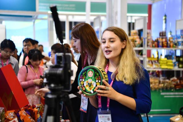 9月19日,外國參展商在楊凌農(nóng)高會展臺進(jìn)行直播。新華社記者 張博文 攝