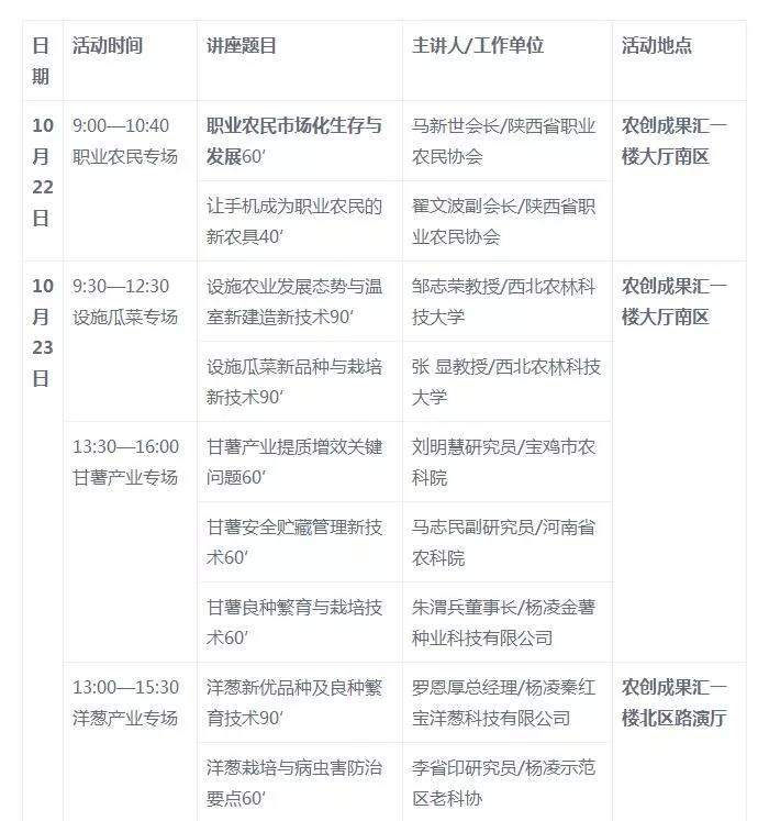 農(nóng)高會(huì)期間,將舉辦九場(chǎng)實(shí)用新技術(shù)培訓(xùn)交流活動(dòng),邀請(qǐng)陜西省職業(yè)農(nóng)民協(xié)會(huì)、西北農(nóng)林科技大學(xué)、寶雞市農(nóng)科院、河南省農(nóng)科院、楊凌職業(yè)技術(shù)學(xué)院等知名院校和協(xié)會(huì)的農(nóng)業(yè)類專家和“大咖”主講。