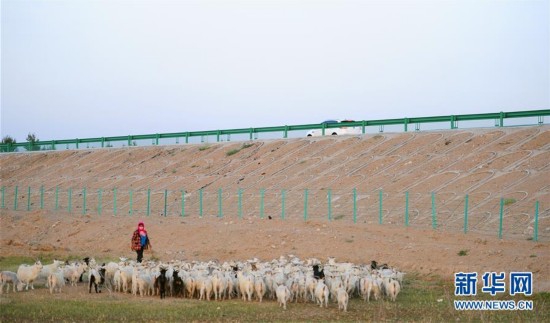 這是京新高速臨白段內(nèi)蒙古巴彥淖爾境內(nèi),羊群從路基下走過(7月14日攝)。