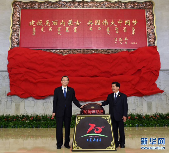 在贈送紀(jì)念品儀式上,俞正聲和中共內(nèi)蒙古自治區(qū)黨委書記、人大常委會主任李紀(jì)恒,一同為習(xí)近平總書記題詞賀匾揭幕。