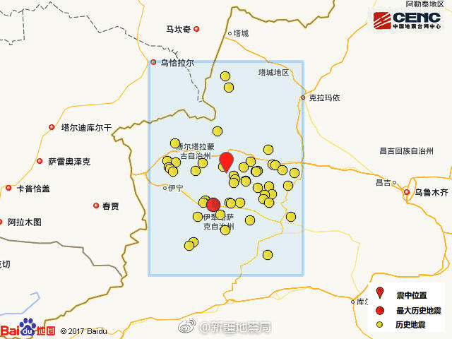 中國地震臺網(wǎng)正式測定:2017年08月09日07時27分52秒在新疆博爾塔拉州精河縣(北緯44.27度,東經(jīng)82.89度)發(fā)生6.6級地震,震源深度11千米。