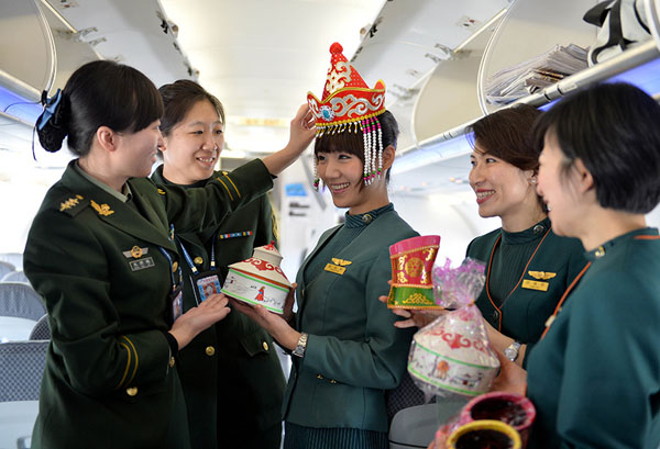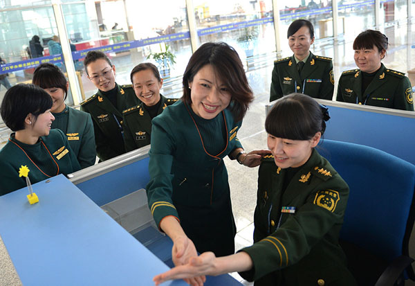 3月5日,呼和浩特邊檢站的女檢查員為臺灣長榮航空公司的空姐們送上小禮物。