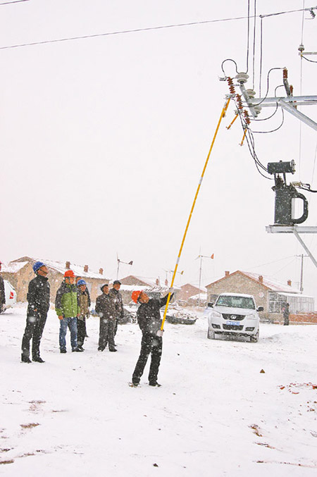 高寒地帶的錫林郭勒有效施工期短,圖為太仆寺電力公司職工在2013年寒冬施工場景。