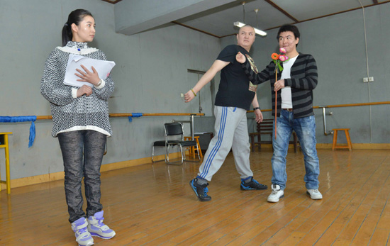 2月26日,演員在排練蒙古劇《敖包相會(huì)》《秋收》一場(chǎng)戲。王正 攝