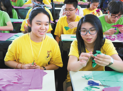 7月5日,由國(guó)務(wù)院僑辦和廣西壯族自治區(qū)僑辦聯(lián)合主辦的2017年海外華裔青少年“中國(guó)尋根之旅”夏令營(yíng)在廣西賀州市舉行。來(lái)自中國(guó)、印度尼西亞、泰國(guó)的營(yíng)員參加了這次夏令營(yíng)活動(dòng),一起體驗(yàn)中國(guó)傳統(tǒng)文化。圖為兩名東盟國(guó)家營(yíng)員在學(xué)習(xí)中國(guó)傳統(tǒng)剪紙技藝。
