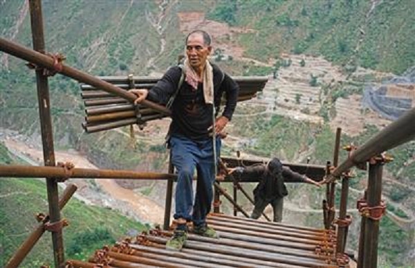 6月17日,懸崖村,60多歲的村民伍有則背負(fù)著10根總共一百多斤的鋼管,在攀登鋼梯,這些鋼管被用來(lái)維護(hù)鋼梯,填補(bǔ)一些縫隙較大的地方。