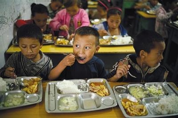 16日,勒爾小學(xué)6歲的學(xué)前班學(xué)生陳木黑在吃營(yíng)養(yǎng)餐,餐具是學(xué)校統(tǒng)一配發(fā)的。
