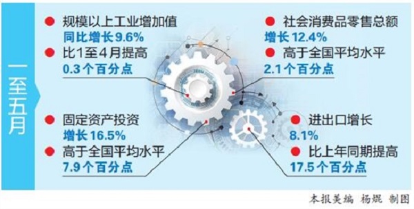 投資增速小幅放緩。1至5月,全省完成固定資產(chǎn)投資(不含農(nóng)戶)5494.26億元,同比增長16.5%,增速比1至4月回落0.5個百分點,高于全國平均水平7.9個百分點,居全國第4位、西部第4位。