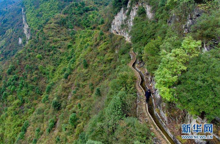 2017年3月24日,黃大發(fā)在巡查水渠途中,身旁就是懸崖。新華社記者 劉續(xù) 攝