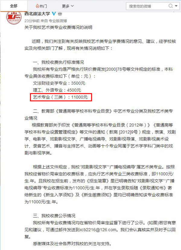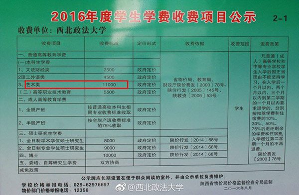對于學(xué)生的質(zhì)疑,3月31日,西北政法大學(xué)在官方微博上發(fā)布《關(guān)于我校藝術(shù)類專業(yè)收費情況的說明》,稱:我?!皯騽∮耙曃膶W(xué)”、“廣播電視編導(dǎo)” 屬藝術(shù)類專業(yè),按照我校經(jīng)省物價局審定的收費標(biāo)準(zhǔn),應(yīng)執(zhí)行藝術(shù)類專業(yè)三類收費標(biāo)準(zhǔn),即11000元/生.年。