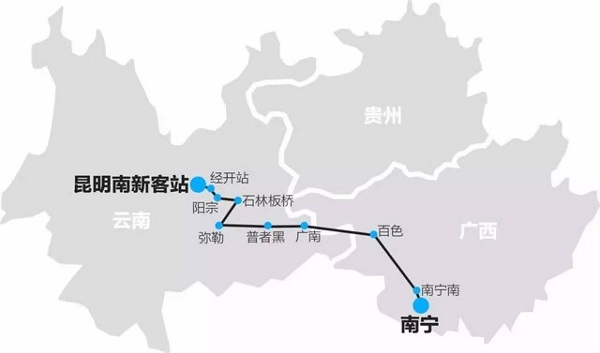 據(jù)了解,南昆客運專線百色至昆明正線全長486千米,將在今年底全面開通運行。列車目標速度為200千米每小時,沿途設百色、富寧、石林阿詩瑪、昆明南等14個車站。