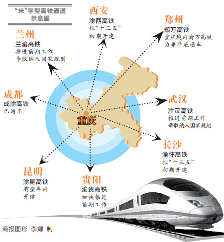 如何構(gòu)成“米”字型?據(jù)介紹,除了重慶西向到成都(成渝),還有西北向到蘭州(蘭渝),北向到西安(渝西),東北向到鄭州(鄭萬),東向到武漢(渝漢),東南向到長沙(渝懷),南向到貴陽(渝貴),西南向到昆明(渝昆)。上述鐵路建成后,我市將形成8個方向的“米”字型高鐵通道。該工作人員表示,除了渝萬、鄭萬高鐵外,其他高鐵都還在規(guī)劃階段。