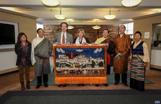 代表團(tuán)到訪的首站是科羅拉多州博爾德市。在博爾德市政廳前廣場鑲嵌有一塊用英語和藏語兩種語言書寫的“拉薩,西藏”地磚。地磚邊刻有一句話:“通過雙方人民、社區(qū)之間的互信尊重、理解和合作推動世界和平。”