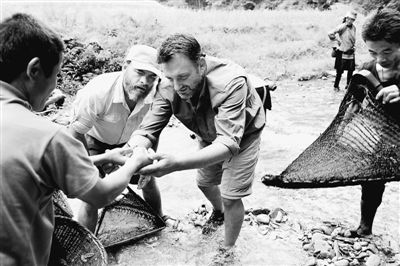 法國(guó)喜劇演員科爾尼亞克(左)和主持人洛佩斯(右)跟苗族人學(xué)捕河水中的魚(yú)蟲(chóng)。