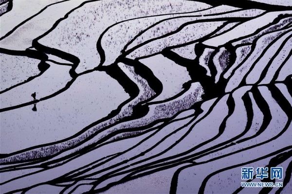 云南元陽梯田阡陌縱橫,線條流暢,如同木刻版畫一般(2015年1月25日攝)