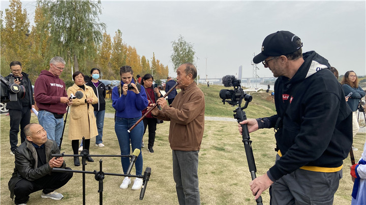 “網(wǎng)紅”們記錄非遺傳承人胡永漢吹奏洞蕭 攝影:吳宇婷