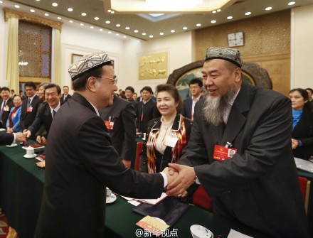3月10日上午,中共中央政治局常委、國(guó)務(wù)院總理李克強(qiáng)參加十二屆全國(guó)人大四次會(huì)議新疆維吾爾自治區(qū)代表團(tuán)審議?,F(xiàn)場(chǎng)一位維吾爾族女代表為總理戴上一頂花帽。總理親切跟大家打招呼,與代表們一一握手。他說(shuō):“你們從很遠(yuǎn)的地方來(lái),我要和每位代表握握手!”