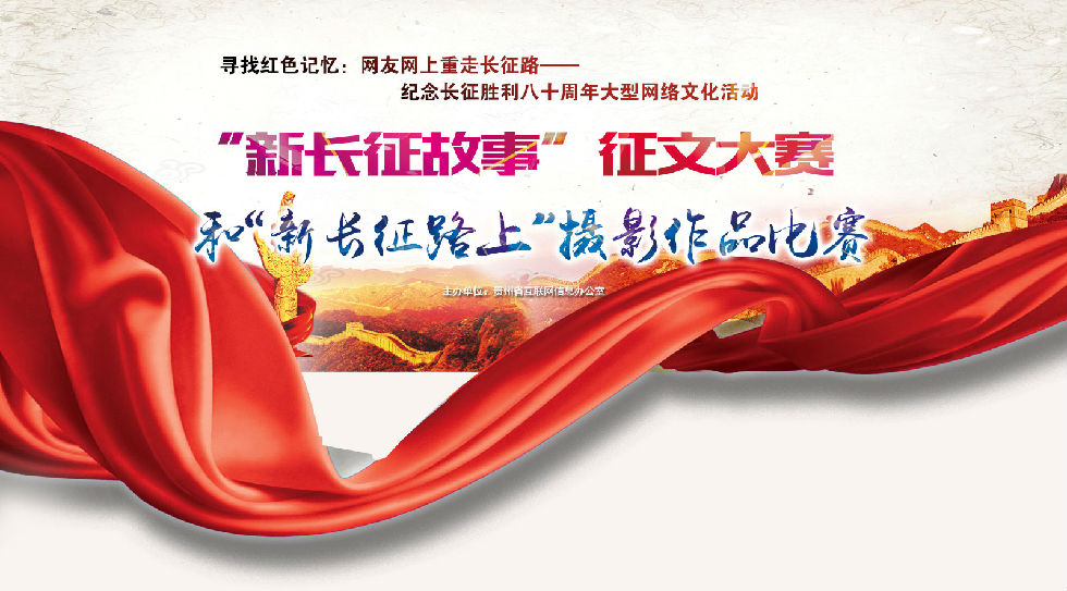 多彩貴州網(wǎng)訊(本網(wǎng)記者湯馥銘)為紀(jì)念長征勝利80周年,弘揚(yáng)優(yōu)良傳統(tǒng),由國家互聯(lián)網(wǎng)信息辦公室主辦、貴州省互聯(lián)網(wǎng)信息辦公室和多彩貴州網(wǎng)承辦的“追尋紅色記憶:網(wǎng)上重走長征路”——“新長征故事”征文大賽、“新長征路上”攝影比賽活動(dòng)2015年12月15日正式啟動(dòng)。兩項(xiàng)活動(dòng)最終將評(píng)選120名獲獎(jiǎng)網(wǎng)友,可獲獎(jiǎng)金及證書。
