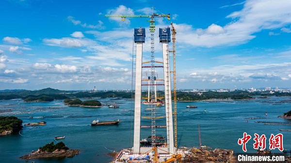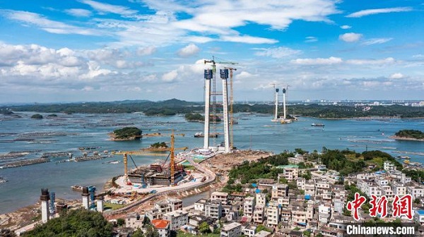 廣西龍門大橋西主塔順利封頂。(無人機(jī)拍攝) 張涵 攝