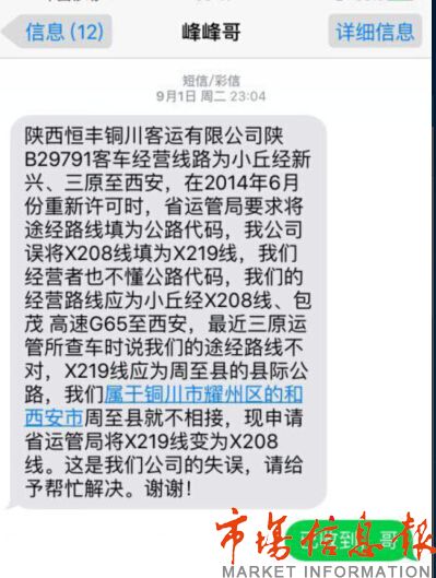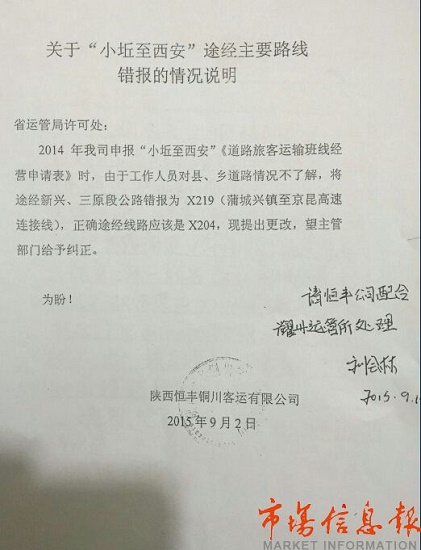 家住銅川市耀州區(qū)小丘村的魏振民師傅,從2012年7月份開始,一直經營著小丘至西安的線路,途徑新興和三原,線路正常運營了十三年之久,基本有效的解決了山區(qū)老區(qū)群眾出行難的問題。2014年陜西省交通運輸管理局要求他所在的銅川恒豐客運公司將地名變更為路標,并上報所有車輛的延續(xù)經營手續(xù)。由于銅川恒豐公司對線路情況不太了解,出現了一個小的筆誤,將他的車輛代碼x204誤寫為x219,上報給省運管局,省運管局許可處在審核的時候也未發(fā)現誤寫的信息,結果在今年8月份底三原客運股在例行檢查的時候發(fā)現了他的車輛路碼代號不對,就讓他停運了。在此之前,他掛靠的銅川恒豐公司于2015年9月13日向陜西省交通廳運輸管理局申請糾錯,至今仍未解決。